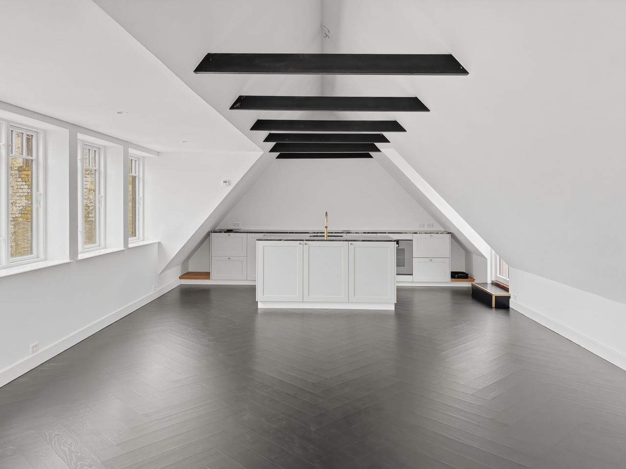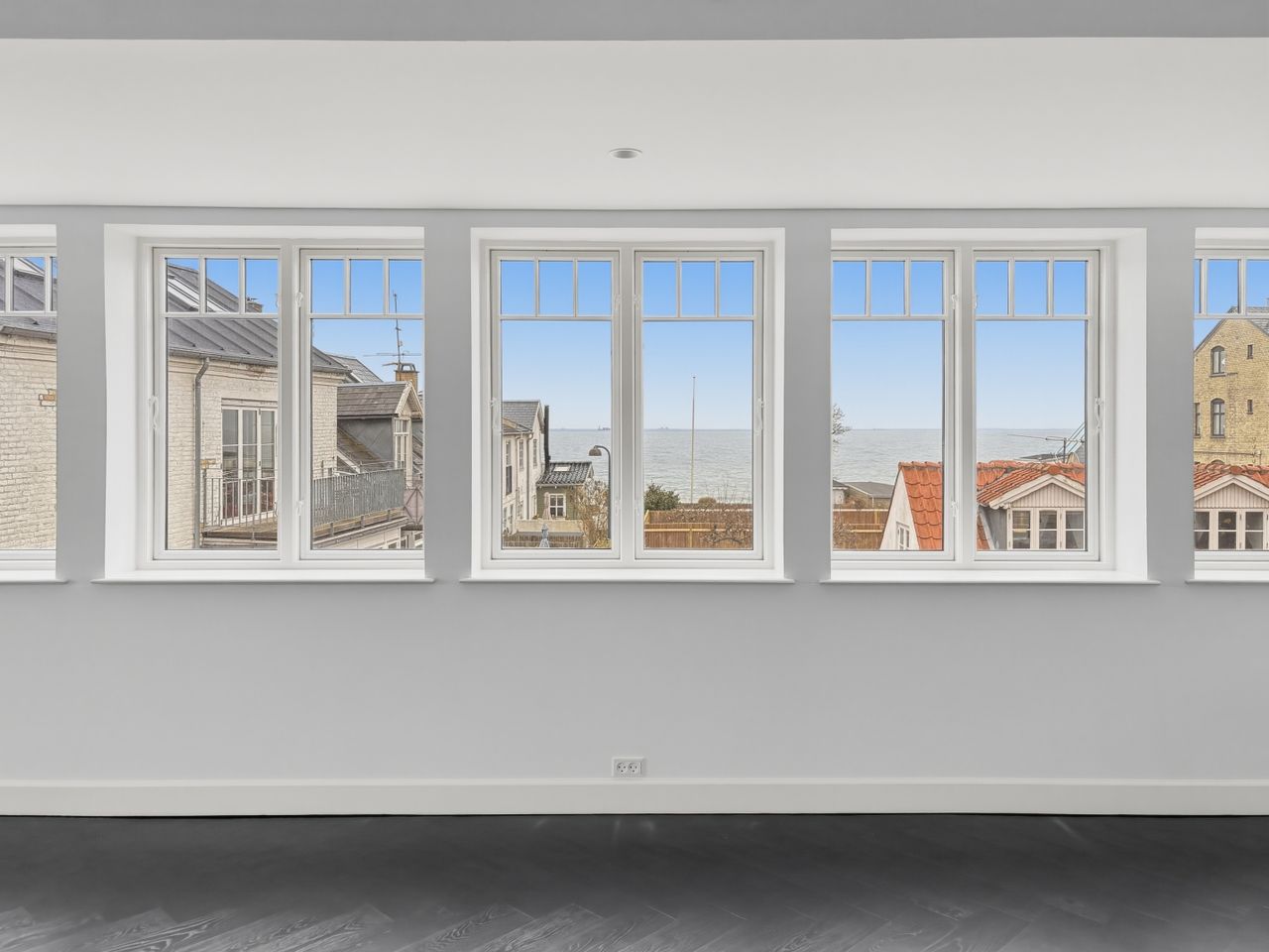 På førstesalen ligger boligens opholdsrum med køkken og stue i åben forbindelse. De store vinduespartier sikrer et flot lysindfald, og fra stuen er der udgang til to altaner mod Strandvejen og skøn udsigt over Øresund i den anden side.