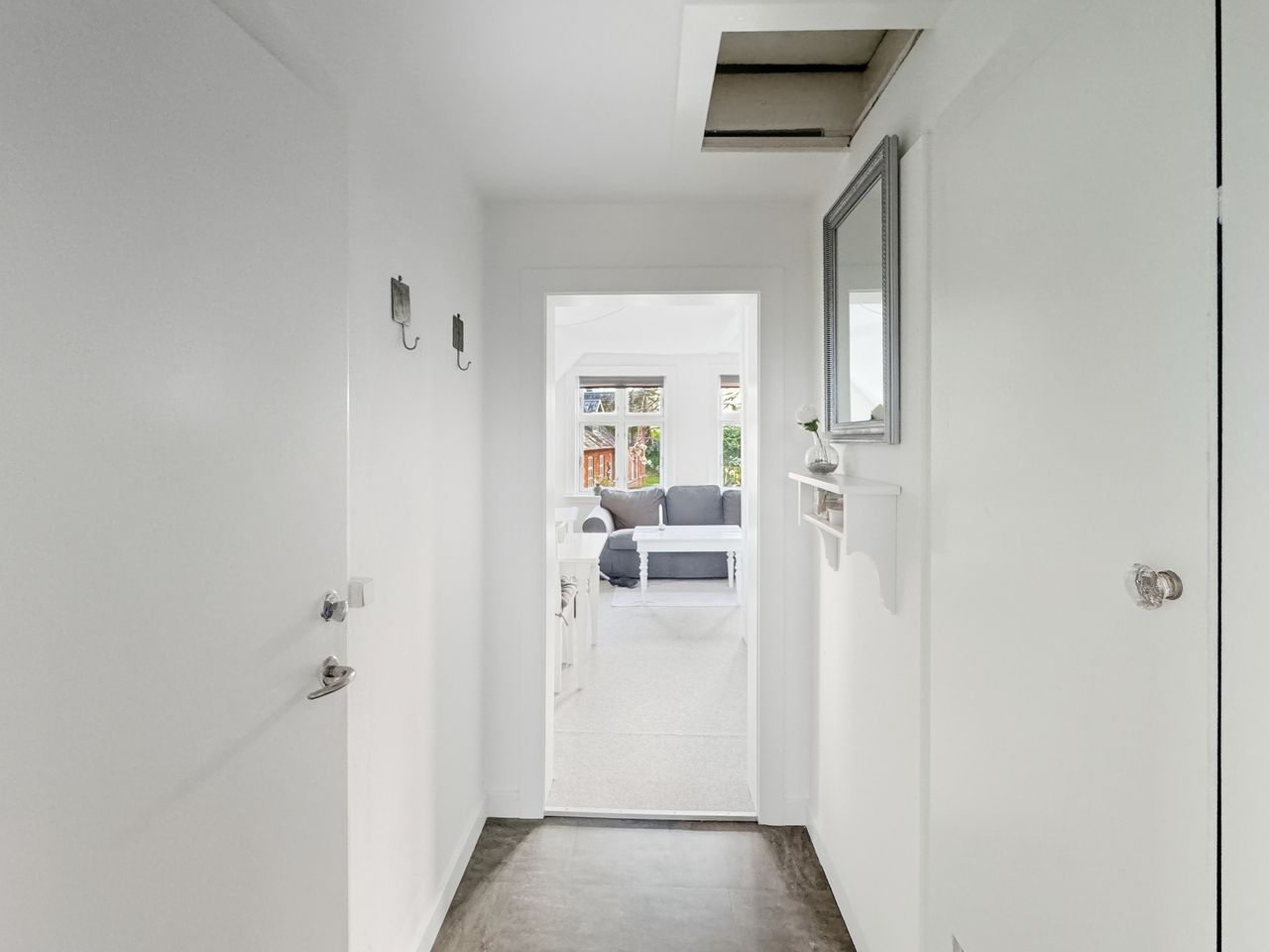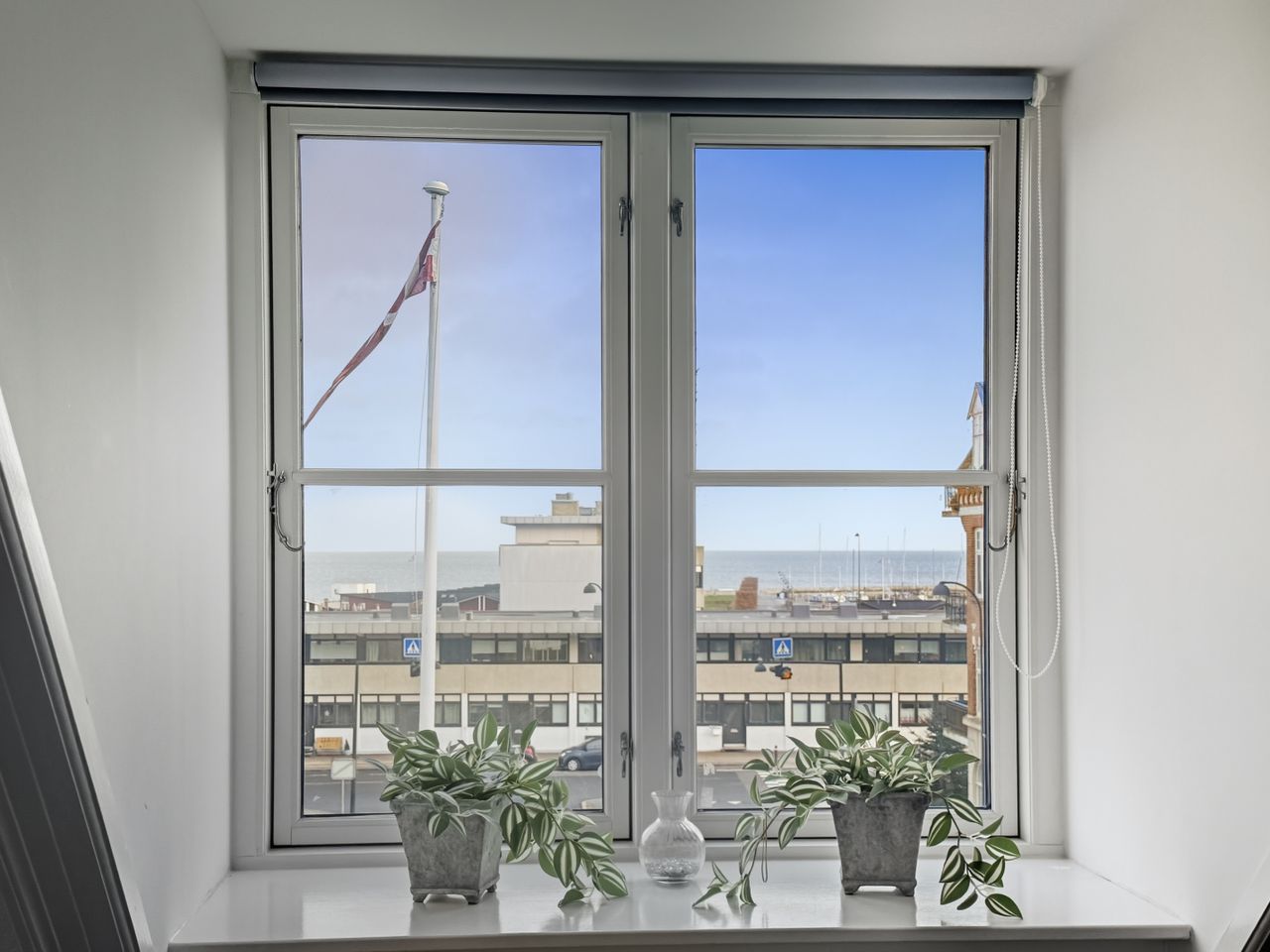 Man bydes velkommen af en lys entré, som fordeler til både stue og soveværelse. Stuen har udsigt mod havet og et behageligt dagslys. Soveværelset har plads til både seng, opbevaring og skrivebord og har fra det østvendte vindue ligeledes udsigt mod vandet og havnen. Køkkenet er mindre, men funktionelt indrettet og placeret i tilknytning til dagligstuen. Badeværelset fremstår enkelt og velholdt, og ligger i direkte forbindelse med soveværelset.
